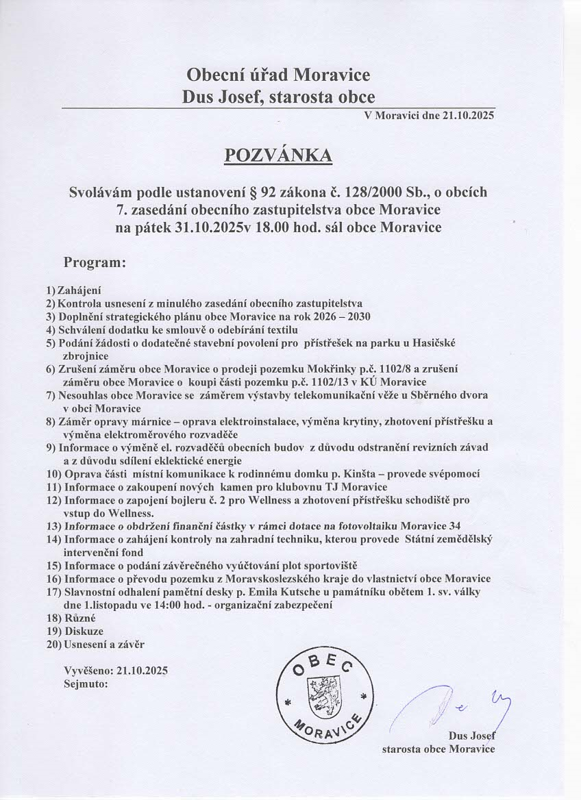Pozvánka č. 7 na pravidelné jednání obecního zastupitelstva konané dne 31.10.2025